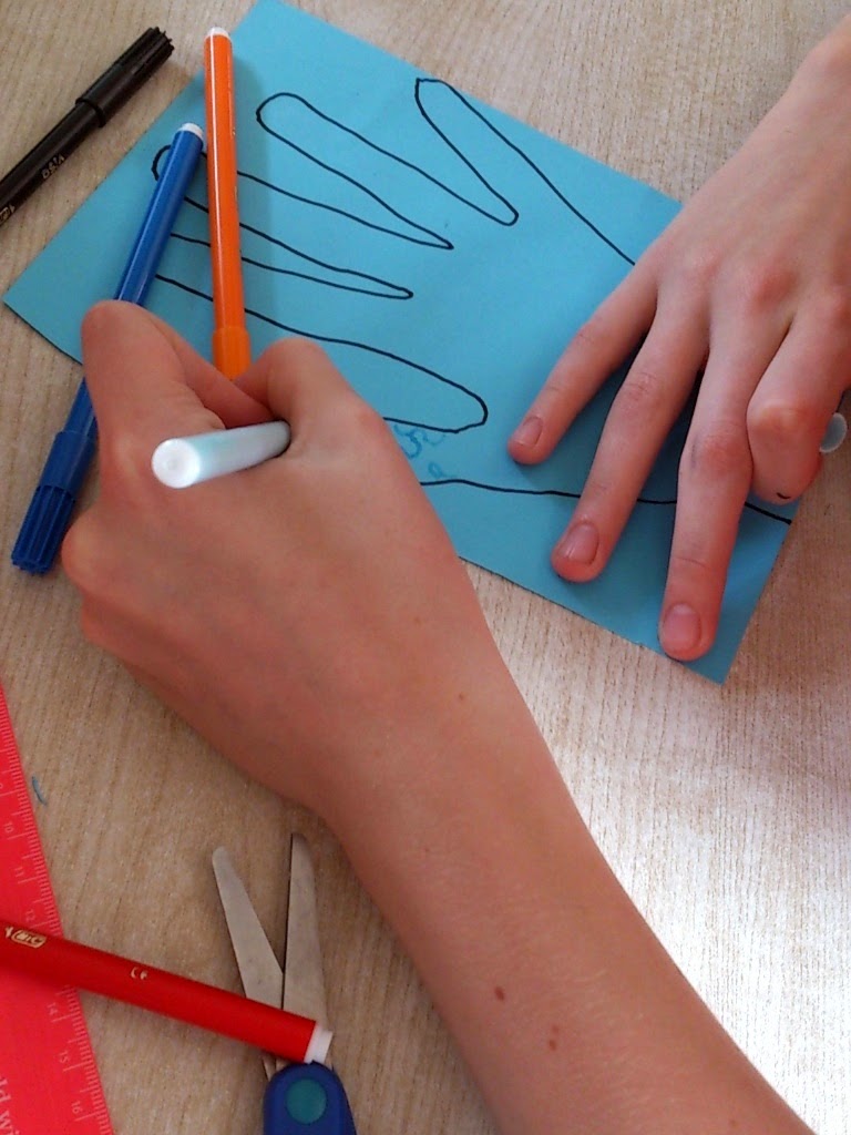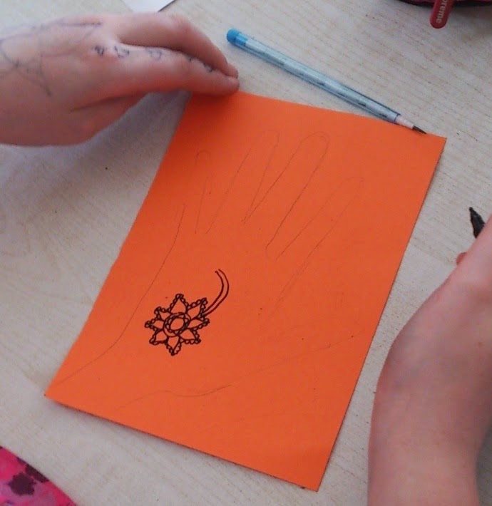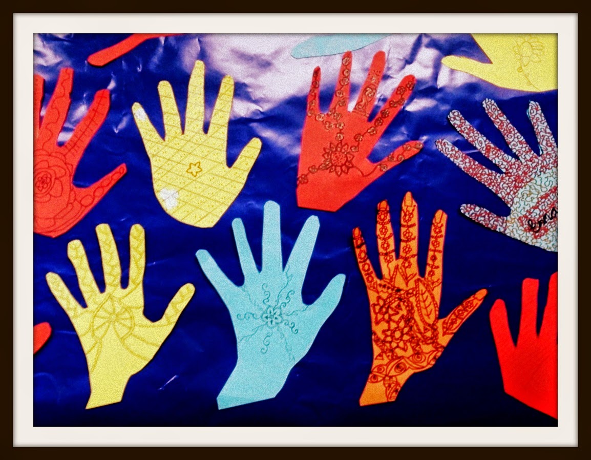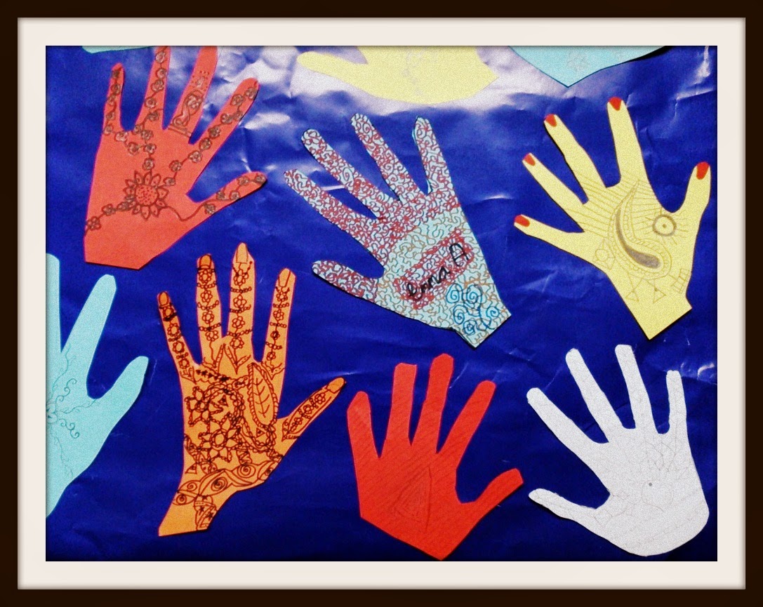 To celebrate the Islamic festival of Eid ul-Adha we learned about Henna today. We made a stencil of one of our hands and designed it with a unique Henna design.