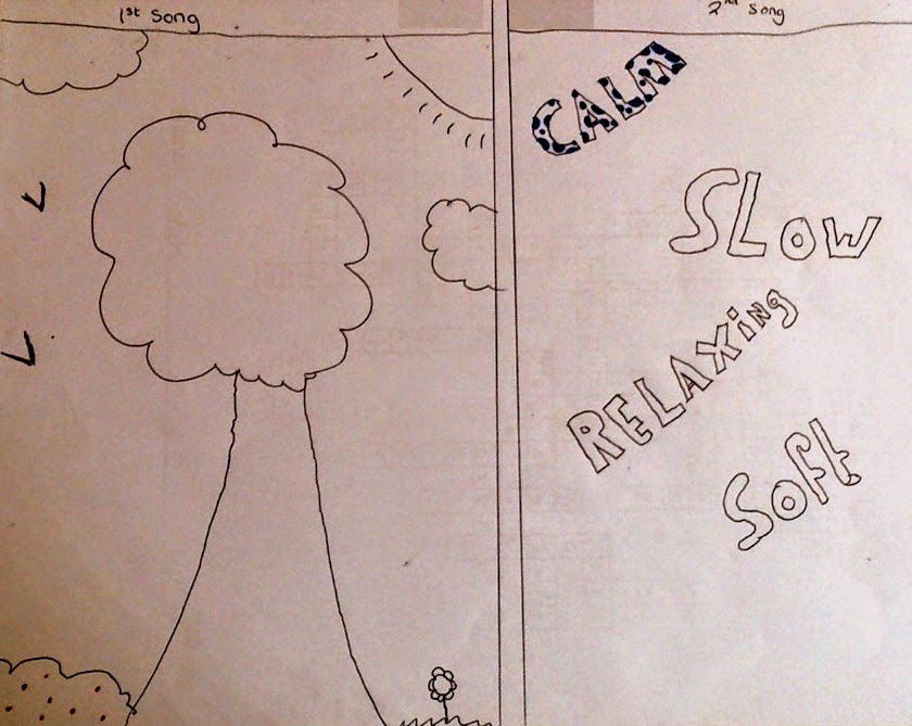 We listened to 2 pieces of music today. Without knowing who the composers are or the titles of the pieces of music we responded by drawing pictures/words on a page about both pieces of music.