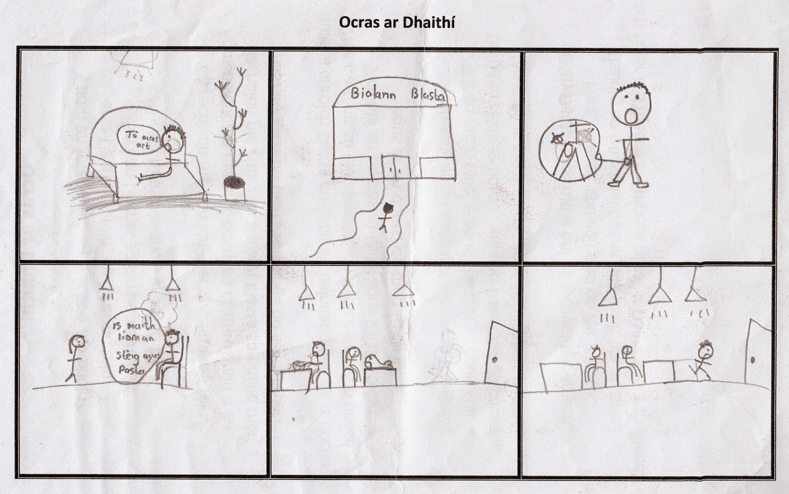 Mar chuid den staidéar atá á dhéanamh againn faoi láthair ar an téama bia dhearamar sraithphictiúir bunaithe ar an dán Ocras ar Dhaithí. An bhfuil tú ábalta scéal an dáin a thuiscint? Brúigh ar an sampla thíos chun níos mó a fheiceáil.