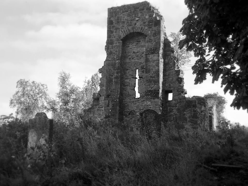 In the wall of the ruin there is reputed to be a cavity shaped like a chalice. There was a local tradition whereby people were cured of eye ailments by dipping their fingers in the water from the chalice and using it to wash their eyes. Another reputed cavity in a nearby stone is known as the 'Devil's Foot'. The story goes that anyone who puts his or her hand or foot in the cavity will be unable to remove it.