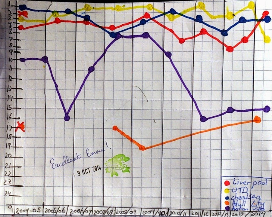 In maths lesson today we moved on to multiple trend graphs. We were given data on the final position of 5 Premiership football teams from 2004/05 season to 2013/14 season. We plotted the data on our multiple trend graphs. Here are some examples of our finished products by CO'N and EL.